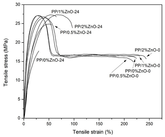 Tensile stress-stain curves of all PP/ZnO nanocomposites exposed to sunlight for 0 and 24 weeks.