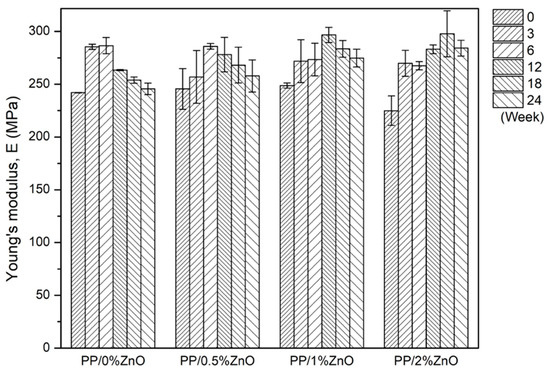 Young’s modulus of PP/ZnO nanocomposite materials at various ZnO contents (from 0%–2%) during exposure to sunlight (note: error bars are standard deviations).