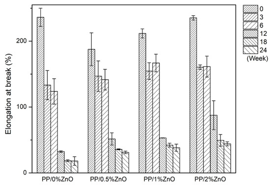 Elongations at break points of PP/ZnO nanocomposite materials at various ZnO contents (from 0%–2%) during exposure to sunlight (note: error bars are standard deviations).