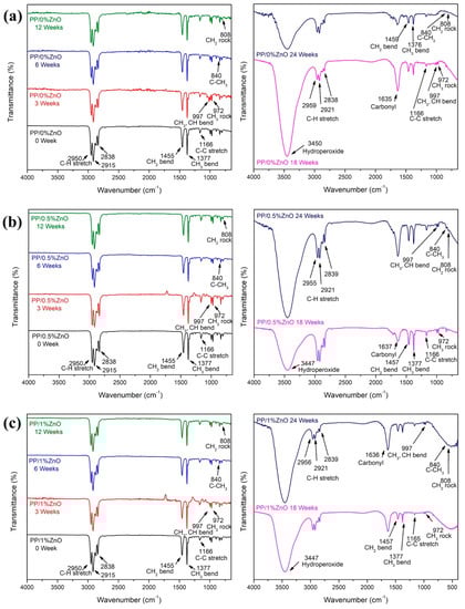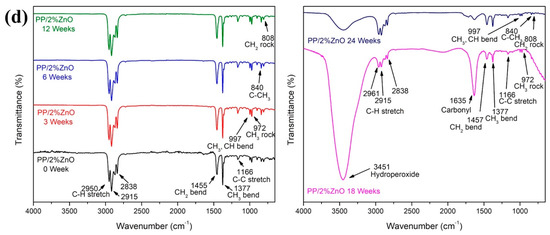 All PP/ZnO nanocomposites show the chemical structure of PP which consists of a linear structure of carbon atoms connected with methyl (CH3) groups [36] (Figure 7). Peaks of C–H, CH3, and C–C, at 2900, 1377, and 1166 cm−1, respectively, were obviously seen in the PP/0%ZnO samples at 0 weeks.