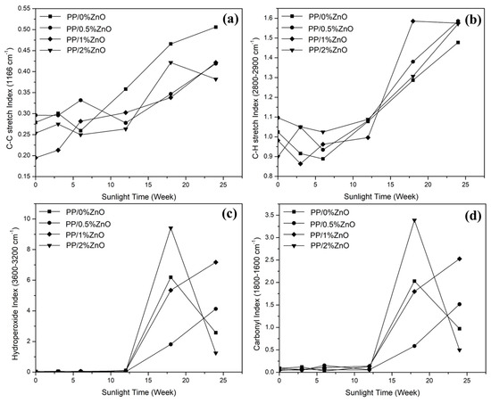 In order to perform a quantitative study, the chemical structure indexes of C–C bond, C-H bond, hydroperoxide, and carbonyl species were calculated using the peak at 1377 cm−1 (C–H bending of CH2) as the reference. The results are shown in Figure 8. It was found that the C–C stretching gradually increased with the exposure time, while C–H stretching was found to decrease a bit from 3 to 12 weeks and after that increased significantly during 12–24 weeks. Differently, hydroperoxide and carbonyl species exhibited the increase during 18–24 weeks. With ZnO, the composites exhibited higher hydroperoxide and carbonyl species compared with neat PP.