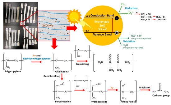 ZnO in PP composites under exposure to sunlight exhibited photocatalytic degradation. Detailed reaction mechanisms which explain this phenomenon of nanocomposites in PP materials were proposed by Bustos-Torres et al. [2], Sirelkhatim et al. [21], and Gutiérrez-Villarreal and Zavala-Betancourt [37]. Figure 9 shows a proposed mechanism for photocatalytic polymer degradation with crosslink and bond breaking in PP/ZnO nanocomposites. When a photon (hν) matches or exceeds the band gap energy of ZnO (3.2 eV, from conduction band (CB) and valence band (VB) of about −0.5 eV and about 2.7 eV, respectively) [8], electrons can be activated and produce oxidative species. Alkyl radicals can be subsequently generated by the oxidative species. Crosslinking can be generated from the alkyl radicals to produce C–C bonds.