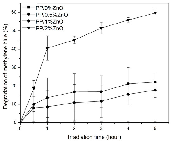 To demonstrate an application of PP/ZnO nanocomposites in the photocatalytic field, the photocatalytic degradation of methylene blue in solutions under UVA irradiation was investigated using PP/ZnO nanocomposite samples as the catalysts. Figure 10 shows the relationship between photocatalytic degradation of MB at different reaction times. The percentage of MB degradation was directly related to the irradiation time which can confirm the UV-vis absorption of nanocomposite materials [38]. PP/1%ZnO and PP/0.5%ZnO nanocomposites exhibited MB degradations of about 15%–20% within 5 h. The error bars of both nanocomposites are overlapped, so the MB degradations are not statistically different. This is due to the nature of nanocomposites with low contents of the filler. The ZnO photocatalysts could contact MB solution at only the surface of the nanocomposites, caused relatively not high photocatalytic MB degradations at low contents of ZnO. PP/2%ZnO nanocomposite exhibited the highest photocatalytic activity among all of the nanocomposites with 59% of degradation of MB within 5 h.
