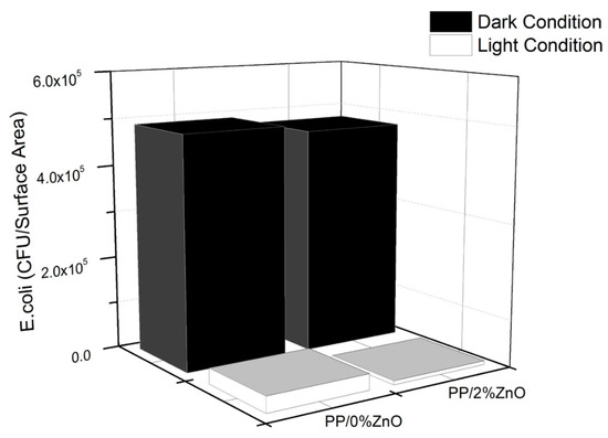 Generally, it has been observed that the antibacterial activity of ZnO to inhibit bacterial growth could occur under light conditions as well as dark conditions [21]. In terms of dark conditions, the antibacterial activity of PP/2%ZnO in the dark was caused because of the cell walls of E. coli are in direct contact with ZnO [21] and the release f Zn ions (Zn2+) can effectively destroy the cell membrane activity of the E. coli [43]. Besides, under light conditions, Zn2+ also react with oxygen (O2) in the air and water leading to the generation of reactive oxygen species and HO. which destroy the bacterial cell membranes [30]. Besides, under light conditions, Zn2+ also reacted with O2 in the air and H2O leading to reactive oxygen species (HO, H2O2, O2−) through a photocatalytic activity that destroys the bacteria cell membranes [30].