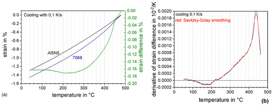 Evaluation procedure dilatometric analysis: Alloy 7068, solution annealing 480 °C 10 min, and cooling rate 0.1 K/s. (a) raw strain data of sample and baseline measurement as well as strain difference of these two and (b) derivation of strain difference.