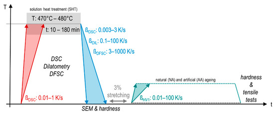 - Milkereit, B.; Kessler, O.; Schick, C. Quench Sensitivity and Continuous Cooling Precipitation Diagrams. In Encyclopedia of Aluminum and Its Alloys; CRC Press: Boca Raton, FL, USA, 2019; ISBN 9781351045636. [Google Scholar]