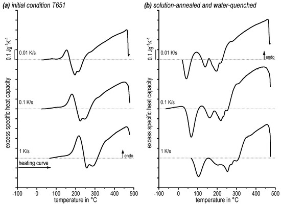 The sequence of endothermic dissolution and exothermic precipitation reactions during heating of alloy 7068 has been analysed for various heating rates. Previous DSC melting tests with 0.3 K/s revealed the solidus temperature to be 491 °C [23]. Thus, the temperature range analysed extends from 20 °C (sometimes from −70 °C) up to 485 °C, keeping the sample in the solid state. For improved readability the DSC curves shown in Figure 4 are shifted, showing the curve with the lowest heating rate on top. Endothermic changes are plotted upwards. The dissolution behaviour of two different initial conditions, namely T651 (Figure 4a) and as-quenched (Figure 4b), was investigated.