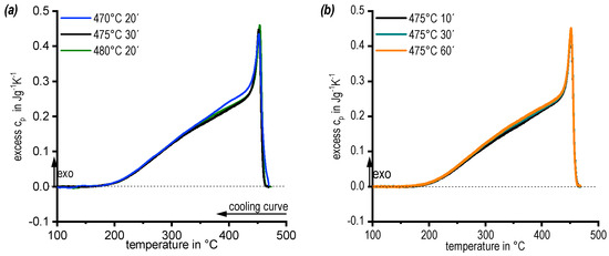 To allow a sound selection of the solution annealing temperature and duration, DSC cooling curves after solution treatment at 470, 475, and 480 °C were compared, see Figure 5a. In general, the DSC cooling curves are very similar. They show at least two overlapping precipitation reactions (details are given in Chapter 3.3.). However, in detail it can be seen that after solution treatment at 470 °C for 20 min, an instantaneous onset of precipitation with onset of cooling occurs. This indicates an incomplete dissolution of the main alloying elements, acting as nuclei for precipitation [24]. To ensure a complete solution, the temperature for the solution treatment was set at 475 °C (−480 °C). In the next step the soaking duration was varied between 10 and 60 min, see Figure 5b. The DSC cooling curves from any soaking duration were highly similar. 30 min at 475 °C (10 min at 480 °C) were defined as solution treatment duration.