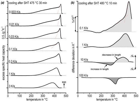 The DSC cooling curves show exothermic precipitation when the signal exceeds the zero level, since only exothermic precipitation reactions can occur during cooling. DSC cooling (Figure 6a) reveals a relatively sharp onset after slight undercooling (below the solvus) followed by a very broad reaction shoulder, similar to other highly concentrated AlZnMgCu alloys [8,25]. This undercooling is in the range of few K at the slow rate of 0.01 K/s and increases with increasing cooling rate. At the rate of 3 K/s the onset of precipitation is seen at about 440 °C and thus the undercooling is about 30 K. The second broad exothermic precipitation during slow cooling ranges from about 465 to 180 °C. This indicates a severe overlap of multiple exothermic precipitation reactions. With an increasing cooling rate, the peak area decreases, i.e., in total the precipitation reactions are supressed. The critical cooling rate cannot be quantified by conventional DSC measurement, since at the fastest rate of 3 K/s a precipitation enthalpy of about 20 J/g is still measured.