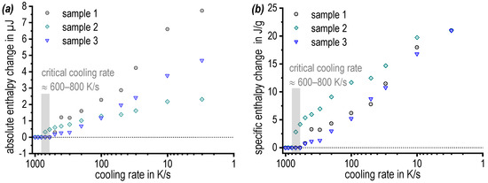 Differential fast scanning calorimetry (DFSC) results of three samples 7068: (a) absolute enthalpy change and (b) specific enthalpy change.