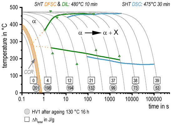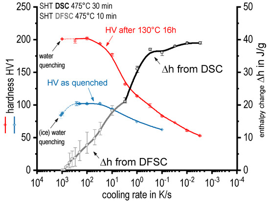 To compare the precipitation enthalpies from DSC and DFSC with hardness values of the distinct cooling rates Figure 8 is plotted. Average, minimum, and maximum values are shown for the enthalpies. The averaged hardness values are plotted with their standard deviations from six single indentations. The cooling rate axis is scaled logarithmic with high cooling rates on the left in order to allow alignment with the time axis of the following continuous cooling precipitation diagram in Figure 9.