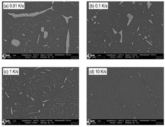 SEM-secondary electron images of alloy 7068: Cooling rates (a): 0.01 K/s; (b): 0.1 K/s; (c) 1 K/s; and (d) 10 K/s.