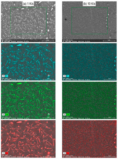 SEM-EDS maps for Zn, Mg, and Cu of alloy 7068 after cooling at (a) 1 K/s and (b) 10 K/s.
