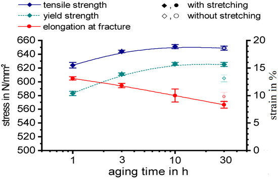 Mechanical properties of alloy 7068: With or without stretching 3%, different ageing times 1, 3, 10, and 30 h at 130 °C.
