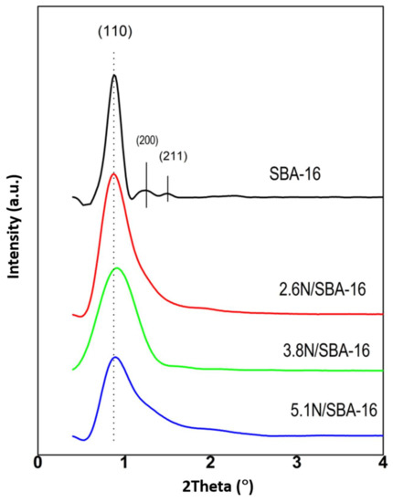 The possible structure changes after SBA-16 grafting with -NH2 groups was investigated by powder low-angle XRD technique (Figure 1). The XRD pattern of the calcined SBA-16 shows reflections at 2θ = 0.88°, 1.22°, and 1.50° indexed as [110], [200], and [211]. All these peaks are associated with the cubic symmetry (Im3m) of cage-structured mesoporous SBA-16 silica material. Contrary to the bare SBA-16 substrate, the low-angle XRD patterns of the xN/SBA-16 samples did not show higher Miller indices reflections ([200] and [211] for characteristic cubic Im3m spatial groups) suggesting that functionalization of SBA-16 substrate leads to a structure with minor pore arrangement and a major presence of nitrogen molecules [28].