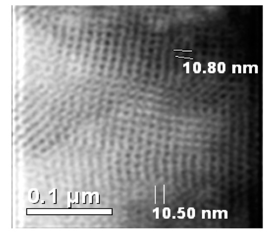 However, a transmission electron micrograph (TEM) image of the representative 3.8N/SBA-16 sample showed a well-ordered Im3m cubic array of mesopores (Figure 2). Therefore, it can be inferred that the mesoporous structure of SBA-16 adsorbent did not suffer significant modification after its functionalization with amine groups. For 5.1N/SBA-16, the low intensity of its peak at reflection [110] is linked with a high wall thickness/pore size ratio (Table 1) that originated from a large number of micropores located near the wall surface the pore walls [29].