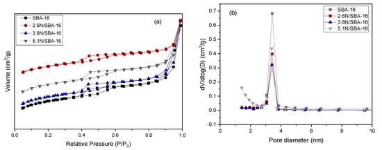 Further insight into the textural properties of the samples was evaluated by N2 adsorption-desorption isotherms. To illustrate this, Figure 3a shows the N2 isotherms of bare SBA-16, and amino-functionalized materials. Irreversible type IV isotherms with type an H2 hysteresis loop was observed in all amino-functionalized and bare SBA-16 material. Type H2 hysteresis loop in the range from 0.4 to 0.6 P/P0 is distinctive from materials with pores with diameters between 3–6 nm [32,33], a structural porosity that can be detected because of the characteristic networking pore model from the SBA-16 material. The hysteresis loop observed at high relative pressures corresponds to the textural porosity due to the voids formed between particles during the analysis. These results are typical of materials with cubic pores and pore network connectivity like SBA-16 and reveal that the mesoporous nature of the material is preserved even though the grafting has occurred, as shown in samples 2.6N/SBA-16, 3.8N/SBA-16 and 5.1N/SBA-16. At approximately P/P0 ≈ 0.4, an explicit change is present, and it is related to capillary condensation that fills the mesopores. When the substrate is functionalized with (-NH2), there is an increase of the volume of adsorbed nitrogen, and the inflection point of the step shifted only slightly from relative pressure of 0.4 to 0.41. The minimum value of adsorbed nitrogen suggests the modification in the pores with amine groups, while the slight relative pressure shift of the step is indicative of mesopore sizes, a key requirement to be an efficient adsorbent.