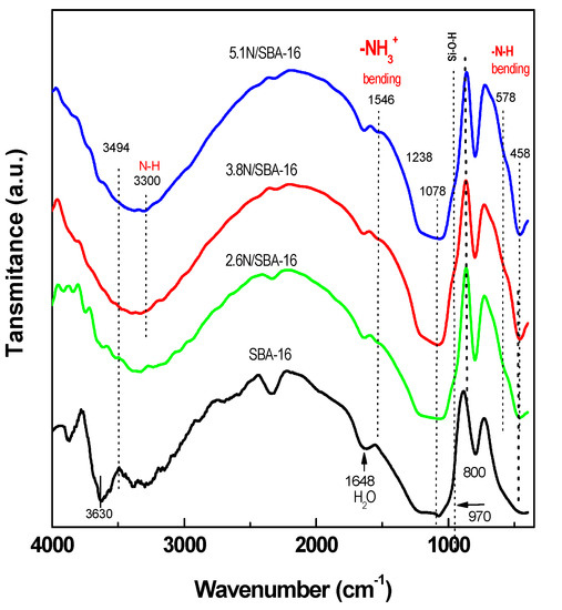 Direct probe on the functionalization of SBA-16 surface by -NH2 groups were obtained from the FTIR spectra of framework vibrations of xN/SBA-16 samples. In Figure 4 are compared the FTIR-KBr spectra of the 2.6N/SBA-16, 3.8N/SBA-16 and 5.1N/SBA-16 samples with those of bare SBA-16 material used as a reference. The spectra show the absorption bands assigned to the structure sensitive vibrations between (SiO4) tetrahedra at about 800 and 1078 cm−1, as well as the structure insensitive vibrations assigned to the (SiO4) tetrahedra at about 458 and 1238 cm−1 [37]. For the pure SBA-16, the band at 1078 cm−1 exhibits a shoulder at about 970 cm−1, which is due to the Si-O-H stretching vibration of Si-O-R+ groups [38]. For the xN/SBA-16, the absence of this shoulder should be taken as indirect evidence of the functionalization of the SBA-16 substrate with amine groups. The direct evidence of the N-H bending mode vibration should be obtained from the peak at about 1646 cm−1 as well as from a shoulder at about 578 cm−1. Finally, the peak at about 1546 cm−1, could be ascribed to the symmetrical–NH3+ bending vibration.