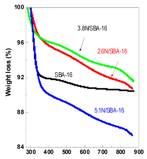 Thermogravimetric curves of SBA-16, 2.6N/SBA-16, 3.8N/SBA-16, and 5.1N/SBA-16 adsorbents.