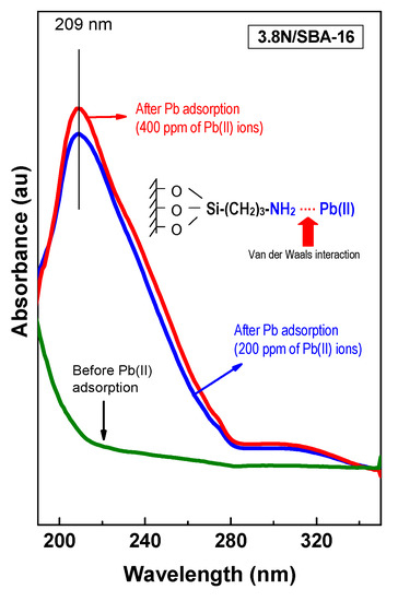 Next to the lead adsorption with initial Pb2+ concentrations of 200 and 400 ppm, UV-Vis spectra were recorded to exhibit the changes on the 3.8N/SBA-16 material. Figure 6 shows only a little larger lead absorption occurring at higher Pb2+ ion concentration in solution (400 mg L−1). The scheme of Pb2+ ions complexation with the amino group of 3.8N/SBA-16 is shown in the inlet of Figure 6. It is assumed that van der Waals electrostatic interaction is taken place at the amino groups in the surface of the adsorbent with the Pb2+ ions, explaining its mechanism of adsorption [1]. The absorption spectra of all adsorbents display two bands: an intense band appears at 210 nm, and a less intense band is observed at ca. 310 nm [43]. These transitions contain both ligand-to-metal charge transfer (N 2p → Pb 6sp) and intraatomic (Pb 6s2 → Pb 6sp) character (for Pb in Oh: a*1g2 → a*1g1t*1u1) [44]. Both absorption bands can be used to gain qualitative information about the affinity of Pb2+ for the amine groups of the xN/SBA-16 adsorbents.