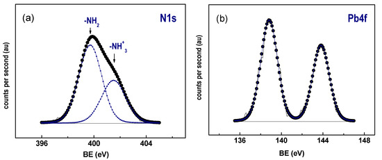 To clarify the type of Pb species formed on the surface of the amine-functionalized SBA-16 after Pb2+ ion adsorption, the most optimized 3.8N/SBA-16 sample was also studied by the XPS technique. Table 3 lists the binding energies of Si 2p, O 1s, N 1s and Pb 4f7/2 core electrons of 3.8N/SBA-16 sample, whereas Figure 7a,b shows its N 1s and Pb 4f7/2 core-level spectra, respectively. For comparison purposes, some XPS data of the SBA-15-based counterpart [1] are included in Table 3. In good agreement with our previous study [1], the 3.8N/SBA-16 sample shows the O 1s peak at about 532.9 eV which is characteristic of oxygen in Si–O–Si bonds together with two peaks (Pb4f7/2 and Pb4f5/2) derived from spin-orbit splitting (Figure 7b). The binding energy of the Pb 4f7/2 core level appeared at 139.0 eV and 139.2 eV. According to the literature [45], the Pb 4f binding energies are stronger than the energies corresponding to the orthorhombic PbO compound (137.4 eV), and it is similar to those reported for Pb(NO3)2 (138.6 eV). There is no evidence that implies precipitation of Pb occurs as hydroxides or carbonates throughout the adsorption process with the XPS results. Finally, -NH2 bonds are attributed to the binding energy at 400.1 eV, while positively charged -NH3+ groups are identified at binding energies of 402.0 eV [46]. Thus, both -NH2 and protonated NH3+ species seem to be present previous to and afterward Pb2+ adsorption. -NH2 groups are predominant in the material, and these can be coordinated with Pb2+ ions through the pair of free electrons. Noticeably, the nitrogen atoms exposed in the surface for the 3.8N/SBA-16 was much lower than for its SBA-15-based counterpart prepared with the same TEOS/APTES molar ratio of 3.3 (N/Si ratio of 0.071 vs. 0.109). Besides this, both adsorbents exhibited a similar Pb/N atomic ratio (0.133 vs. 0.139), suggesting a similar surface exposure of the Pb2+.