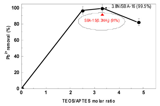 Figure 8 shows the percentage of Pb2+ ions adsorption onto xN/SBA-16 adsorbents functionalized with variable amounts of aminopropyl groups and pure silica SBA-16. The adsorption was performed at pH = 5.0, temperature 30 °C, and contact time of 60 min. As seen in this Figure, the adsorption of Pb2+ did not occur on the pure silica SBA-16. On the contrary, all amine-functionalized SBA-16 materials were good adsorbents for Pb2+ removal. The adsorption of Pb2+ increased with an increase of the TEOS/APTES molar ratio up to 3.3. At this point, the maximum percentage of the removal of the Pb2+ ions from the solution was about 99% (3.8N/SBA-16). At higher -NH2 concentration, a drop in the Pb2+ removal percentage occurs (5.1N/SBA-16). Thus, in good agreement with the previous study on the SBA-15-based adsorbents [1], the best results were obtained using a TEOS/APTES molar ratio 3.3. This is probably because a large amount of APTES molecules with aminopropyl chain shielding close to silanol groups limits the entrance of Pb2+ ions into the inner porous structure of the SBA-16 substrate [47]. However, considering the nitrogen content determined by elemental microanalysis (Table 1), the Pb/N atomic ratio follows the trend: 2.6N/SBA-16 > 3.8N/SBA-16 > 5.1N/SBA-16. Taking into account that the same trend follows their specific surface area, one might conclude that both functionalization and textural properties of the adsorbent are important factors influencing the adsorption efficiency.