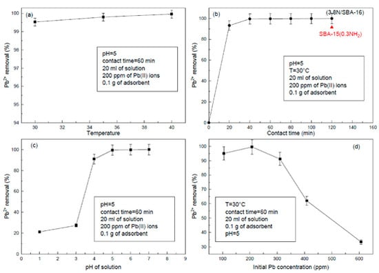 Influence of (a) temperature, (b) contact time, (c) pH, and (d) initial lead concentration on the Pb2+ removal from aqueous solution by the adsorption onto 3.8N/SBA-16. The SBA-15-based counterpart prepared with the same TEOS/APTES molar ratio of 3.3 is used as a reference (from [1]).