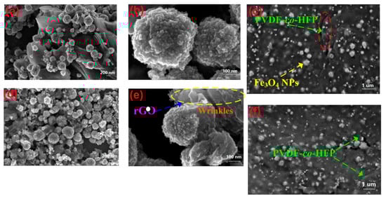 The SEM and TEM images of as-prepared samples are represented in Figure 1 and Figure S1 (Supplementary Materials). When the rGO was decorated by silane coupling reagents, there were more Fe3O4 nanoparticles (NPs) loaded on the surface of Si-modified rGO (Figure 1a,d). The reason is that the existence of –SiOH groups derives from the hydrolysis of –SiOCH3 group within the silane coupling reagent [36], which are preferable to coordinate with Fe3+. Then the Fe3O4 NPs were prepared by in situ reduction. Meanwhile, the spherical Fe3O4 NPs on the Si-modified rGO sheets are featured with rough surface and non-uniform diameters (Figure 1a,b,d,e). As demonstrated in Figure S1 (Supplementary Materials), the composite Si-modified rGO@Fe3O4 still possesses abundant wrinkles as same as that of rGO@Fe3O4 composite, which will benefit for improving the multiple-reflection of EMW [37,38,39]. Furthermore, the SEM images of the Si-modified rGO@Fe3O4/PVDF-co-HFP films illustrate that the Si-modified rGO@Fe3O4 are well dispersive in PVDF-co-HFP (Figure 1c,f).