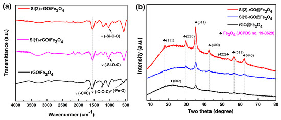 FT-IR spectra (a) and XRD patterns (b) of Si-modified rGO@Fe3O4 nanocomposites.