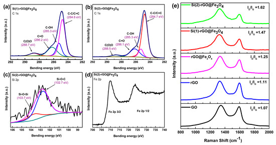 XPS spectra of Si-modified rGO@Fe3O4: High-resolution C1s spectra of (a) Si(1)-rGO@Fe3O4, (b)Si(2)-rGO@Fe3O4, (c) high resolution Si2p spectrum of Si(2)-rGO@Fe3O4, and (d) Fe2p spectrum of Si(2)-rGO@Fe3O4. (e) Raman spectra of all the samples.