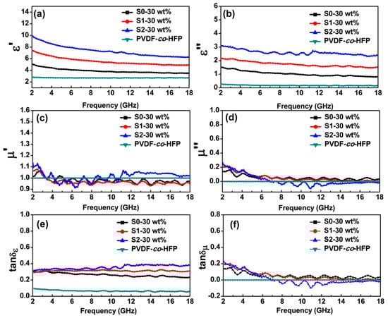 As illustrated in Figure 4e, compared to the dielectric loss tangent (tanδε = ε”/ε’) of the pure PVDF-co-HFP (tanδε = 0.1) and S0 sample (tanδε = 0.3), the higher tanδε values of the Si-modified rGO@Fe3O4/PVDF-co-HFP composites confirm that the silane groups grafted on the rGO surface are more favourable to increase the complex dielectric loss. In particular, S2 sample has the highest tanδε values, corresponding to 0.31–0.38. Furthermore, several resonance peaks in the complex tanδε indicate that the polarization effects may exist in the composites [46]. As shown in Figure 4f, the magnetic loss of samples in the range of 2–13 GHz are greater than that in the range of 13–18 GHz. However, the complex magnetic loss covers weaker values contrast to the dielectric loss. These results suggest that the EMA performance of Si-modified rGO@Fe3O4/PVDF-co-HFP composites is mainly attributed to dielectric loss rather than magnetic loss.