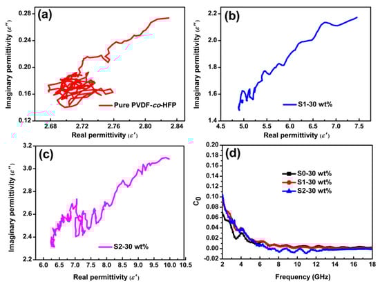 where ε’ and ε∞ refer to the static dielectric constant and the relative permittivity at boundless frequency, respectively. If Debye relaxation process is occurred in composites, several single semicircles are exhibited in the curve of ε’ and ε” [47,48]. As illustrated in Figure 5a–c, the ε’-ε” plots of pure PVDF-co-HFP is mostly disordered, whereas there is plenty of semicircles in the curve of the samples modified by silane groups, verifying that the dielectric loss of Si-modified rGO@Fe3O4/PVDF-co-HFP composites may result from other multiple interfacial polarizations, including Si-modified rGO@Fe3O4, Fe3O4/PVDF-co-HFP and Si-modified rGO/PVDF-co-HFP interfaces, rather than Debye relaxation [22,49]. Besides, the lattice defects and the dipole polarization in Si-modified rGO@Fe3O4 fillers is also helpful for enhancing the EMA performance of samples decorated by silane groups owning to the existence of C–O, Si–O species on the surface of Si-modified rGO@Fe3O4 composites.