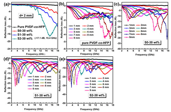 As exhibited in Figure 6a, the pure PVDF-co-HFP at the thickness of 2 mm exhibits poor RL values (RL < −1 dB). After modification with silane groups, the Si-modified rGO@Fe3O4/PVDF-co-HFP composites exhibit the enhanced EMA ability in the range of 2–18 GHz, particularly, the S2 sample modified by Si(2) groups shows high-performance microwave absorption performance in 2–18 GHz frequency. The maximum reflection loss (RLmax) values for S2 sample over the whole frequency range are −17.1 dB at 15.4 GHz. In addition, the S1 sample exhibits the electromagnetic absorption performance over the 18 GHz. Moreover, as shown in Figure 6b–e, the calculated RL values of samples decorated by silane groups in the range of 2–18 GHz are higher than that of pure PVDF-co-HFP and S0 samples without modified by silane groups. The RLmax values for S1 and S2 samples are −27.7 dB at 3.3 GHz with d = 9 mm and −32.1 dB at 3.68 GHz with d = 7 mm, respectively. Meanwhile, S2 sample exhibits a wide absorption frequency bandwidth of 4.8 GHz (RL < −10 dB) at d = 2 mm, demonstrating that Si(2) silane coupling agent is beneficial to improving the EMW absorption broadband of the absorber.