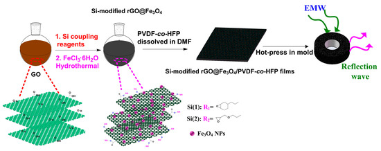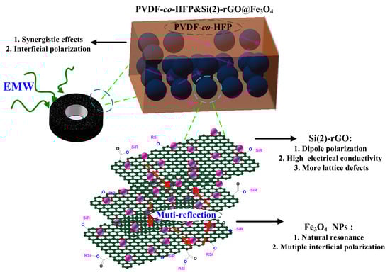 In general, thermoplastic polymer matrices play an important role in the EMA composites due to their excellent mechanical properties [27,28]. Meanwhile, several interfacial effects or synergetic effects have been constantly occurred between the nano-fillers and thermoplastic polymer matrices, which are available for the enhancement of EMA performance of the absorbers [29,30]. Poly(vinylidene fluoride-co-hexafluoropropylene) (PVDF-co-HFP), as a typical dielectric loss material, has been widely applied in the various fields owning to its unique dielectric properties, high mechanical stability and excellent chemical resistance [31,32]. Herein, the fabrication process of two types of Si-modified rGO@Fe3O4/PVDF-co-HFP composites was investigated (Scheme 1). The EMA performance of Si-modified rGO@Fe3O4/PVDF-co-HFP composites could be tuned by different silane groups. Remarkably, the Si(2)-rGO@Fe3O4/PVDF-co-HFP composite achieved the maximum reflection loss (RLmax) value of −32.1 dB (3.68 GHz) at the thickness of 7 mm and the effective absorption frequency bandwidth for reflection loss (RL) below −10 dB was 4.8 GHz at the thickness of 2 mm. Furthermore, the microwave absorption mechanism of Si-modified rGO@Fe3O4/PVDF-co-HFP has been illustrated in detail. Notably, the lattice defects in Si-modified rGO and the synergetic effects of PVDF-co-HFP play an important role in the enhancement of the EMA performance. The analysis of the interference absorption and the impedance matching can also preferably illustrate the high EMA performance of Si-modified rGO@Fe3O4/PVDF-co-HFP composites.