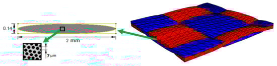 The material under investigation is a plain-weave CFRP laminate (TR3110 360GMP, Mitsubishi Rayon Co., Tokyo, Japan) with layup [#(0/90)]8. It has 8 plies of regular woven fabric with a ply thickness of 0.23 mm (the total thickness ~1.8 mm) and count ends (warp/fill tows) per inch length of 12.5. Each tow contains 3000 continuous fibers with a diameter of about 7 µm. The schematic illustration of the microstructure geometry at the micro- and meso-scales is presented in Figure 1. The single ply (Figure 1) shows the material geometry at meso-scale created by manual processing of the real image (see Section 3 for more details).