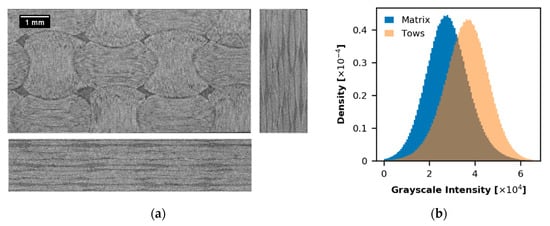 The material was scanned at the custom-designed µ-CT system HECTOR of the Ghent University Centre for X-ray Tomography (UGCT, Gent, Belgium) [23]. Three orthogonal µ-CT slices of the material are presented in Figure 2. The µCT dataset is a 16-bit unsigned integer array with dimensions (368, 972, 1723) pixels that corresponds to the physical size of 1.8 × 4.9 × 8.6 mm³. The scan holds an array of 1 × 2 UC. The gray value in each voxel corresponds with a local linear attenuation coefficient through a slope and offset applied to the unsigned integer value. Each voxel represents a physical volume of ~5 × 5 × 5 µm3 (note that the voxel size is close to the fiber diameter). Figure 2a shows that the intensity of matrix and tow voxels is similar and the local fiber orientation (texture anisotropy) is not clearly defined. Here, the fiber orientation is extracted only in-plane (fill and warp directions). Visually, it can be identified as the direction of darker lines in tows’ area which comes from rich resin regions. Moreover, the tows’ region has a locally smoother grey transition in the fill or warp fiber direction.