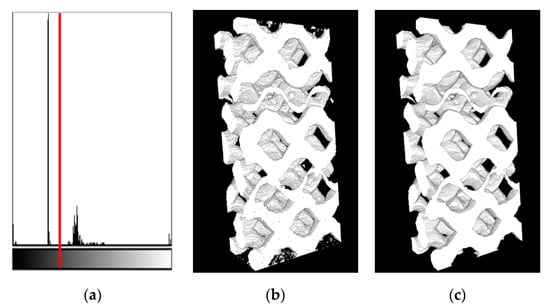 The threshold step was easily performed manually because the background voxels have very high contrast to the tows region (see Figure 6a). Here, the threshold value 65 was taken (the greyscale is from 0 to 255). For example, for the histogram in Figure 6a, the estimated upper limit of voxel count, which could be wrongly classified due to the manual threshold, is less than 0.88% of the total amount of voxels. Note, the splitting of such a histogram could also be performed automatically. The threshold step gives us an image with the small isolated and weakly connected regions (mostly close to the image boundary). These regions were handled during the cleaning step, which includes removing all isolated islands with count of voxels less than 1000 and the median filter application. The median filter had a kernel size of [3 × 5 × 5] voxels, which is small enough for preserving sharp matrix features. This size [3 × 3 × 3] is the smallest possible size of the 3D kernel and the size larger than 5 voxels can oversmooth the given tows structure of the downsampled image significantly. The effect of the cleaning step is shown in Figure 6b,c.
