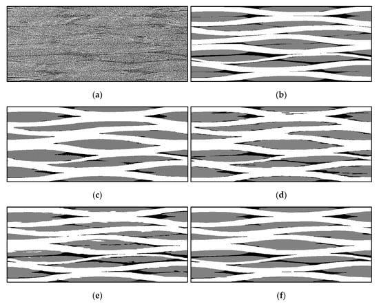 These results were upsampled to the original image size. Then, the fill and warp images were combined into a single image. The resulting image usually has tows intersection regions. These regions and small isolated regions of the matrix were filled by colors of the closest tows’ voxels (function join_images in Appendix A). Corresponding slices of the segmentation result, raw image, and manual segmentation (see Section 7) are presented in Figure 7a–c. Algorithm 3 summarizes the described procedure of the variational segmentation. The processing by the variational approach takes about half an hour of computation time for the aforementioned volume using a standard workstation without GPU acceleration.