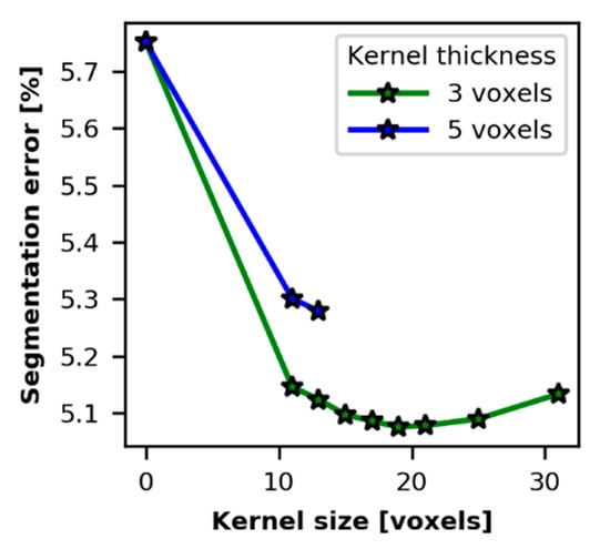 Impact of kernel size of the median filter on the voxel-wise segmentation error.