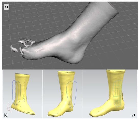 In this study, we rely on the straightforward and versatile combination of Kinect hardware and Skanect software to reconstruct the leg of our healthy volunteer, in order to validate the proposal. These resources do not only reconstruct the 3D geometries of the leg, ankle, and foot, but also link them to additive manufacturing resources via .stl files. Once the .stl file is generated, we use Autodesk Meshmixer as support software for improving mesh quality and obtaining a softer refined surface (with an additional number of elements), which is used as input for the computer-aided design of the personalized splints and related molds, as detailed in the following subsection.