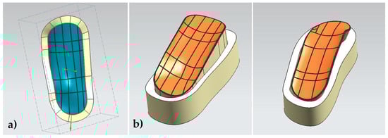 Regarding the design of alternative mold options, following the core–shell approach typical of injection molding systems, we start with the surfaces of the personalized splints by closing the holes designed for the Velcro joining straps and by extending the boundaries of the surfaces to define the partition surfaces (using “sew” and different available surface design and modification tools). We use the generated partition surfaces to cut the blocks of material toward the two required tools, which can be used for lamination.