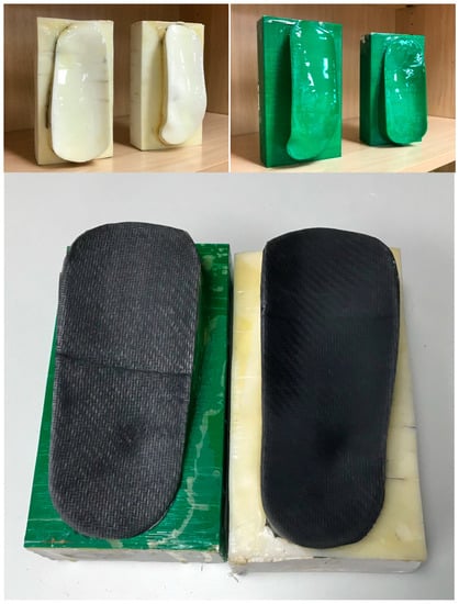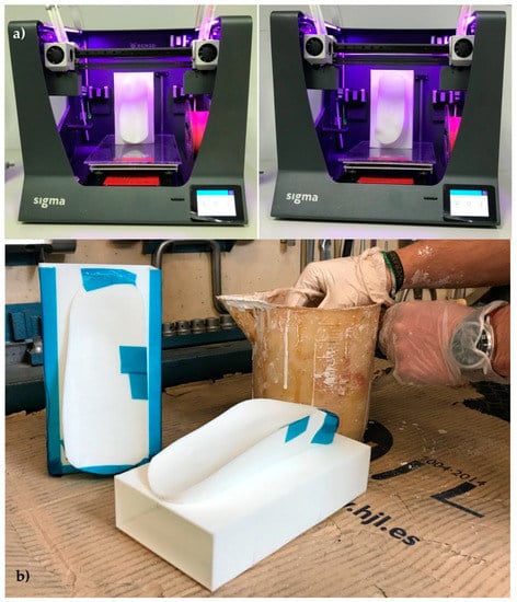 Figure 3 schematically shows the rapid mold manufacture procedure by 3D printing and subsequent clay filling. Two molds for the double-sided ankle splint aimed at improved immobilization are presented. The outer shells of the molds obtained within the FDM 3D printer are highlighted (Figure 3a). Some Scotch-tape patches can be seen in the mold shells for covering minor holes and manufacturing defects of the 3D printing process, hence preventing leakage during the clay filling process (Figure 3b).