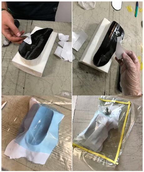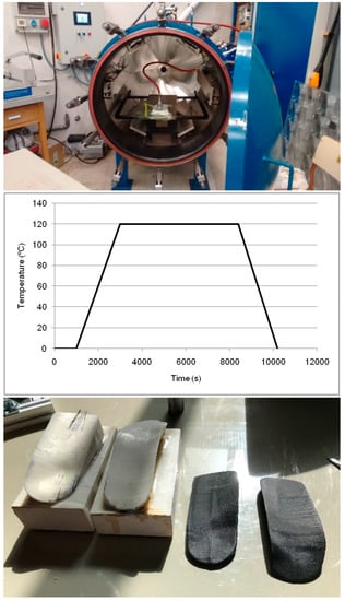 Once lamination is finished, a peelply is positioned over the outer lamina. A release film and a breather ply are positioned afterward. Finally, a vacuum bag is attached using tacky tape at the surface edges. The vacuum bag is perforated for connecting the vacuum valve to the vacuum tube. The whole set is introduced in the autoclave and conducted to a curing cycle, as required for bonding the laminated carbon fiber–epoxy sheets, with a curing temperature of 120 °C and a curing pressure of 5 bar for around 2 h. Temperature ramps of 3 °C/min are used for both the heating and cooling stages. After curing, the laminate is carefully separated from the mold and the edges are cut for its fine tuning to the desired shape.