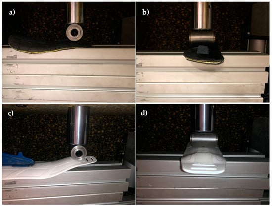 In order to validate their functionality, stiffness measurements are carried out in two replicas of epoxy–carbon fiber composite and customized ankle splints. The splints are manufactured again by the method described in Section 2.2.3, in one case using 4 laminated layers, and employing 7 laminated layers in the other, to compare in terms of weight and stiffness. A commercial ankle splint (Zetiling), whose size is selected to fit the ankle of the same individual for whom the customized splints were designed, is purchased and tested as well, again for comparative purposes with commercially available devices.