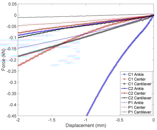 Splint force–displacement graph, showing testing results, both for the carbon fiber–epoxy composite customized ankle splints (C1 and C2) and for a commercial polymeric splint (P1).