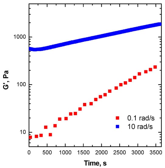 In order to verify the microstructural stability of ENR in the molten state, the time evolution of the viscoelastic parameters was recorded at a constant temperature (180 °C). The results collected from experiments at different frequencies are plotted in Figure 1. The rheological curves show that a significant increase of the storage modulus (G’) took place over the duration of the experiments, particularly for tests performed at low frequency, which is indicative of some modification in the macromolecular architecture of ENR occurring during the measurement []. It is worth noting that the variation of G’ as a function of time was more pronounced in the low-frequency region, i.e., the slow macromolecular dynamics region, where large portions of polymeric material exhibited a large relaxation time.