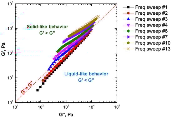 The results obtained from the time sweep tests revealed the instability of ENR during rheological measurements at the selected temperature (Figure 1). These confirmed that conventional frequency sweep tests could not provide valuable and meaningful data for this polymer. Therefore, an accurate evaluation of the frequency-dependent linear viscoelastic behavior of ENR could be obtained using time-resolved mechanical spectroscopy. More specifically, the sample was subjected to several subsequent frequency sweep measurements. The obtained results are shown in Figure 2, in the form of a Han plot []. This type of plot is very useful for monitoring changes in the macromolecular architecture of polymers insofar as it can be used to categorize the events in two different physical-state regimes, i.e., a liquid-like state, characterized by G’ values lower than G”, and the consecutive solid-like state, where the G’ values are higher than G”. At the beginning of the test, ENR showed a liquid-like rheological behavior (G’ < G”), typical of unfilled polymers whose macromolecules are fully relaxed when in the molten state []. After about three frequency sweep tests, a progressive remarkable solid-like behavior appeared, recognizable by the increase of G’ with respect to G” and the gradual flattening of the curves. The progressive dominant elastic behavior as a function of time is indicative of the occurrence of some thermally activated phenomena causing the evolution of the initial ENR microstructure, which affected the polymer viscoelastic behavior.