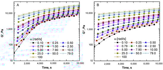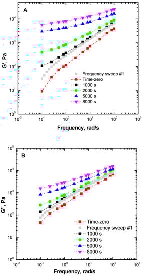 To isolate the effect of the microstructural alterations affecting the resulting changes in viscoelastic behavior, the “isochronal” moduli values for G’ and G” were calculated as the intercept of the vertical line at each time t and by interpolating the experimental data. From this interpolation procedure, it was possible to estimate the modulus values at time zero () as follows: