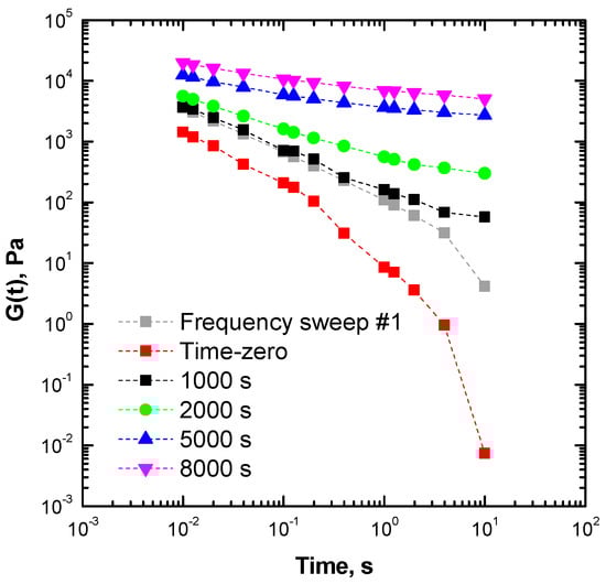 Several studies over the last two decades have shown that the “true” rheological behavior of the so-called transient polymers can be obtained using time-resolved mechanical spectroscopy (TRMS) [,]. In time-resolved rheological measurements, frequency-dependent rheological functions are obtained by subjecting the material to successive frequency sweeps over a realistic time schedule for this type of evaluation. The data collected for each frequency are then plotted as a function of the acquisition time and extrapolated to “zero” time to obtain a fundamental rheological parameter for the material [], alongside the time dependency function for structure evolution. This procedure has often been used to characterize the thermal and thermo-oxidative degradation of polymers, nanocomposites, and blends [,,].
