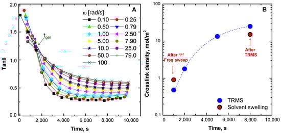 Evolution of tanδ during the TRMS tests (A) and crosslink density (from TRMS data and from solvent-swelling experiments) as a function of time (B).